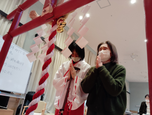 厳かな音楽と共に巫女さんに扮した職員と一緒に参拝しました。