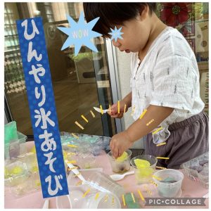 氷を触って‟ひんやりタイム”も楽しみました!氷をカップに入れてジュース作りをしたり、色付けした氷が溶け、色が混ざる変化に着目したり、その不思議さに興味津々でした☺