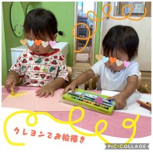 2歳児はクレヨンで描いた絵に絵の具を塗って‟弾き絵”も楽しみました🖌