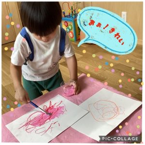 筆の滑る感触、絵の具が垂れる様子など…画用紙とは違う面白さがあるようで、鼻歌を口ずさみながら楽しんでいました♪
